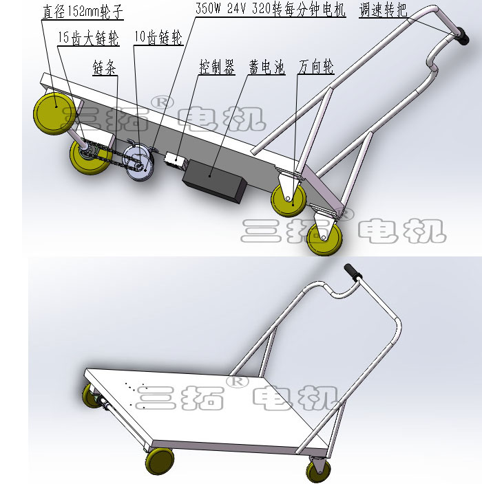 该电机常用于电动自行车,电动手推车,电动手推车见下图,配上图上的结构尺寸,可以在平水泥路面最快一分钟100米的速度推200KG重物。