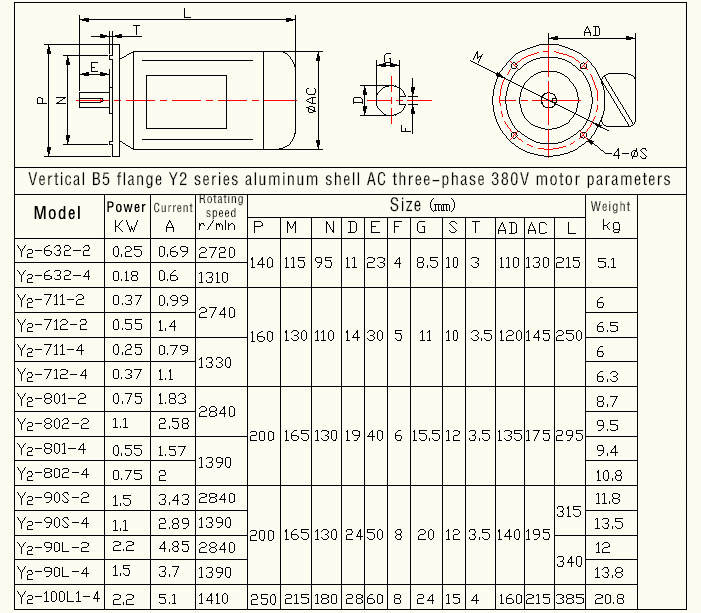 | Y2-90L-4 | 1.5kW | 3.7A | 1390RPM | 10.2N.m | 13.8kg |