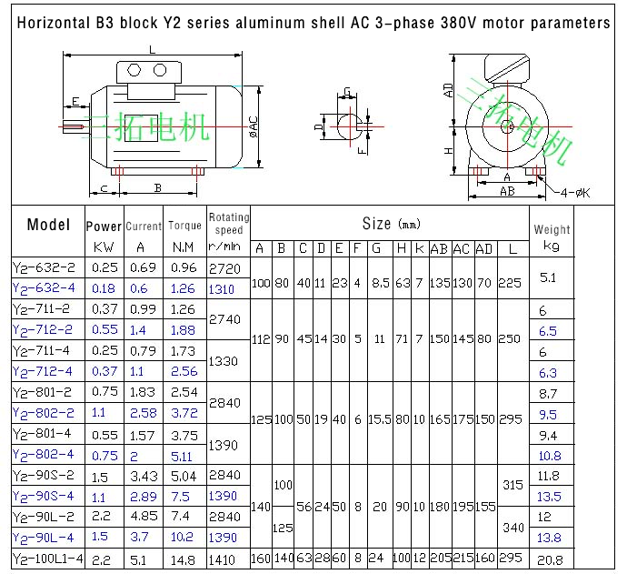 | Y2-801-4 | 0.55kW | 1.57A | 1390RPM | 3.75N.m | 9.4kg |