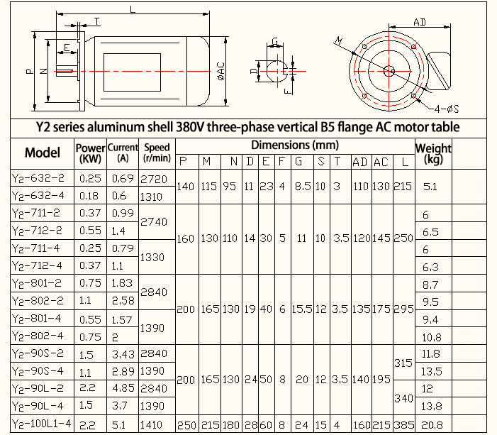 | Y2-802-4 | AC380V | 2A | 0.75kW | 1390RPM | 10.8kg |