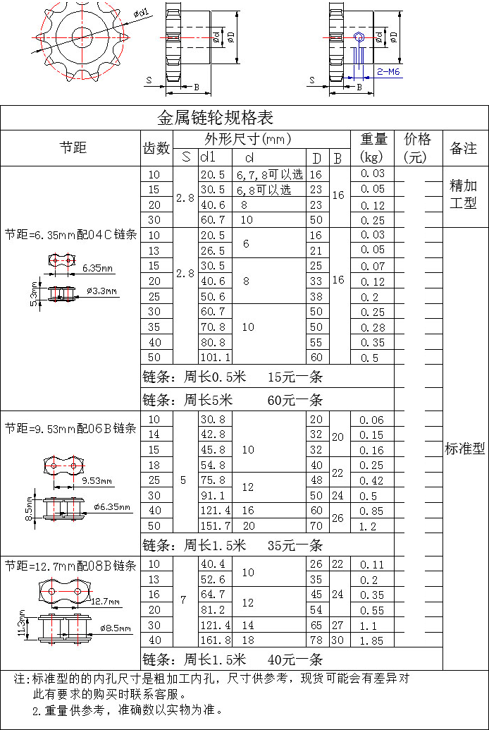 多规格、孔径,有:节距6.35mm(2分)、节距9.53mm(3