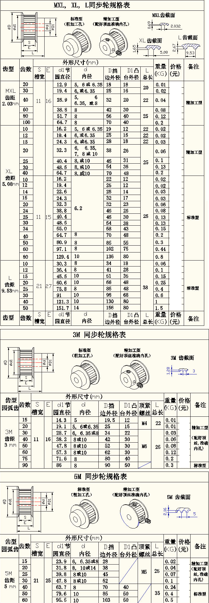 多规格、孔径可选,有:MXL、XL、L、3M、5M,张紧