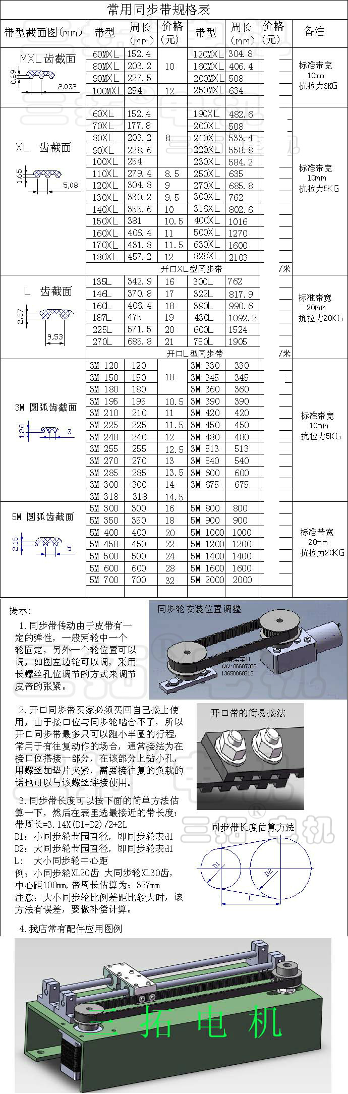 多规格、孔径可选,有:MXL、XL、L、3M、5M,张紧